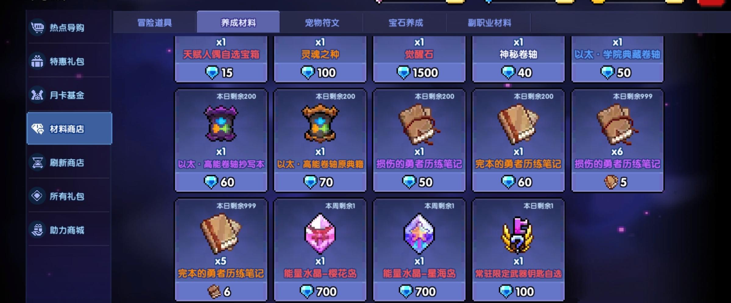 月限购首先就是六折的钥匙,需要的就买。然后还有经验卷轴和外装优先级也是比较高的。剩下的也只能说是需要购买,而宝石的升级材料不建议买太贵了,不如买体力。演变之灵也建议先白嫖为主,重置卡前期钻石不够的话,也可以稍后考虑。武器币和矿不是很建议买,典籍的话前期就真的不建议买(1800钻石太贵了),完本笔记千万不要买!细沙的话缺就可以兑换(毕竟这玩意儿渠道也是比较少的),当然不着急也可以不兑换。技能的话有需要就买,不要买用作升星材料。魔女宠物的话并不是很建议买,普通宠物千万别买