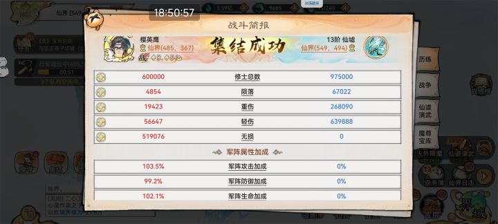 四号位,魔蛊,烟花+残咒(红变异),败芒套纯叠命中,道兵万魂幡。这里命中我叠到了残咒的破防也能挂上的地步。军阵战斗看的不是面板,而是倍率。