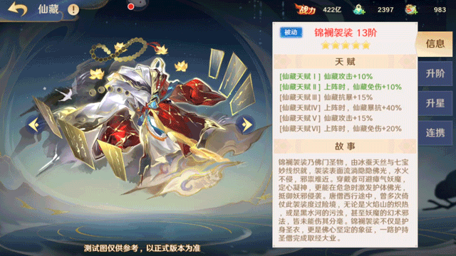 锦襕袈裟:首次释放仙藏技能后,立即回复一定点数仙藏怒气并使下一个行动的仙藏攻击时增加一定百分比暴击和伤害,若下一个行动的仙藏成功击败神将,则再次回复一定点数仙藏怒气。