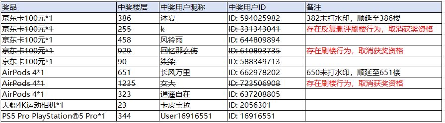 经后台核实,原中奖楼层【929楼、1235楼】的玩家【回忆那么伤、女大】发布的内容存在刷楼行为,原中奖楼层【255楼】的玩家【k】发布的内容存在反复删评刷楼行为,以上三人获奖资格取消,奖品重新抽取公示,以下为刷楼截图和新中奖名单!