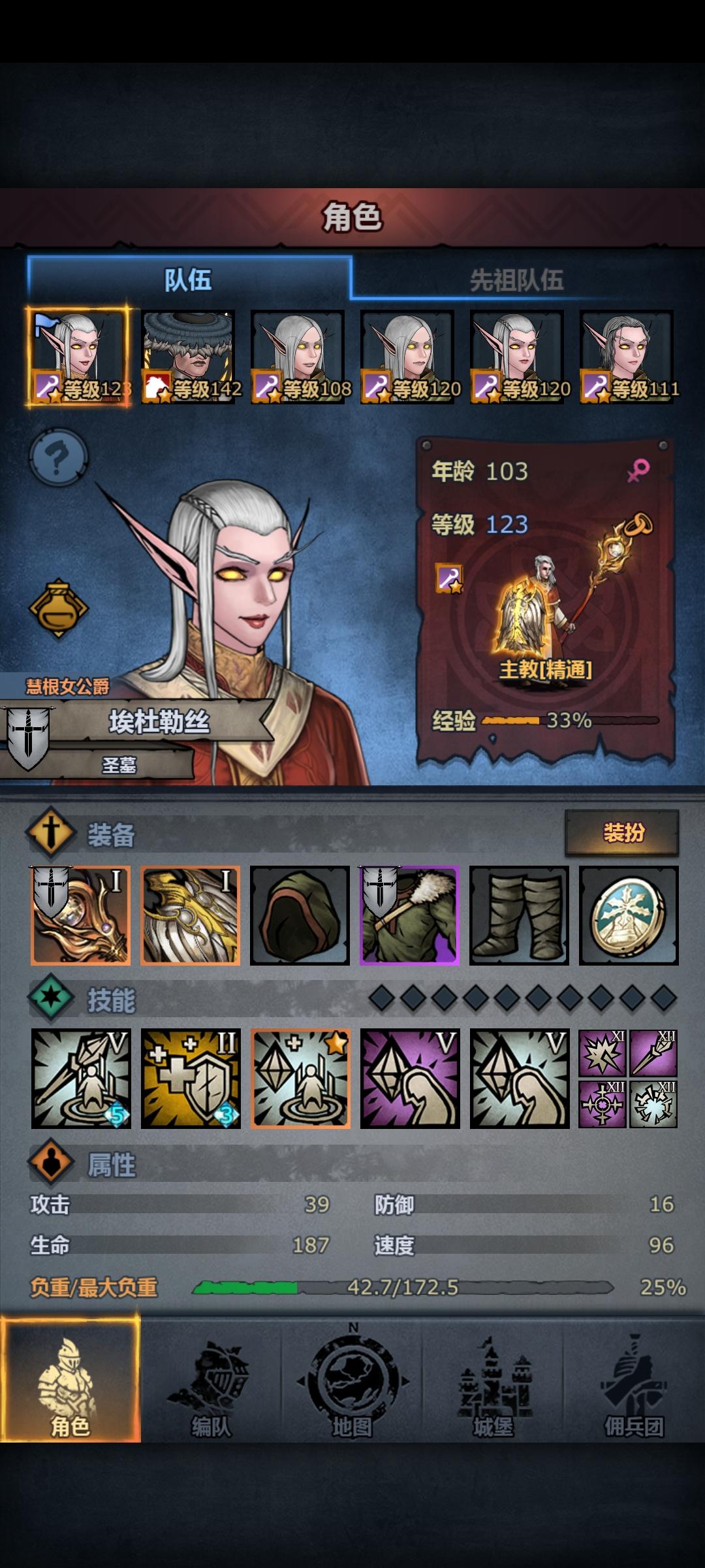 前期法队阵容:一个高强度物理必备(盾勇小公主),主c火德(高感高意),一个辅助主教(恐惧主教需要意志,激励狂热主教有技能就行不看面板,技能看需要换)三个飞鹰颂诗人(高感知就行)。