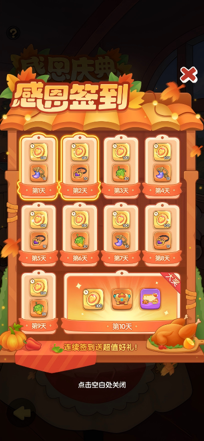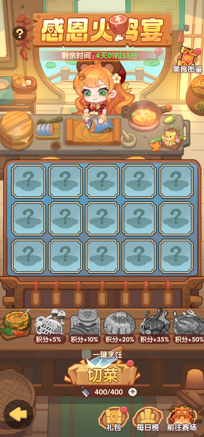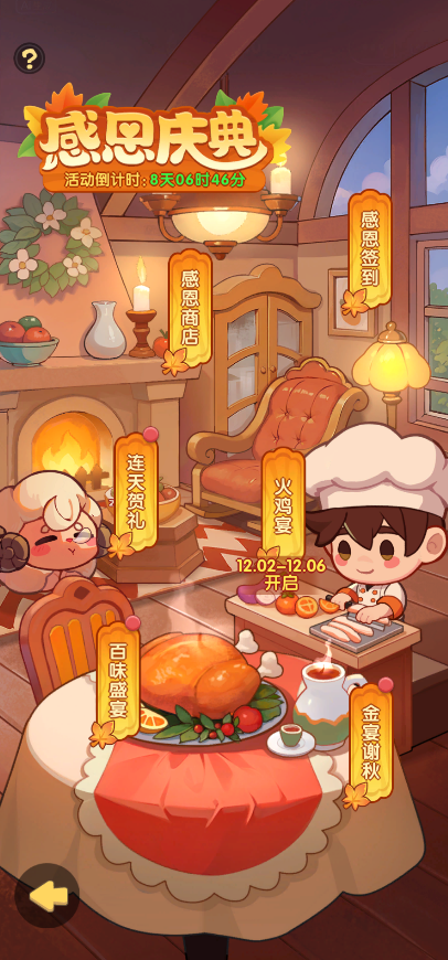 感恩节大餐筹备中,合成高级菜品领好礼~活动时间内使用【火鸡厨刀】可以准备配菜,当配菜占满菜板时会自动合成菜品,合成最终成品菜肴可以获得相应积分。消耗菜品即可参加比赛,比赛获得的积分越多则奖励越丰盛哦~