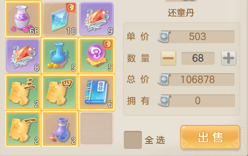 1个宝图,5个护符重置丹,6本经验书,2个彩云沙,若干还童丹和修炼丹