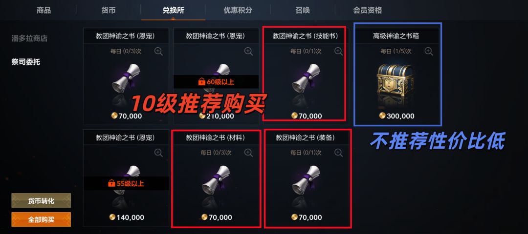 注意!除了主线、掉落和成就给的神谕之书,达到10级后,还可以在商店用7万金币的单价购买至多5个稀有品质的神谕之书,第一天在金币足够的情况下,可以把这5个神谕之书都买了,然后任务全部做完即可~