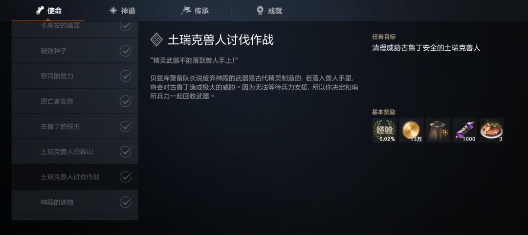 需要注意!随着主线任务的推进,所打怪的难度也会越来越高哦!主线任务给的装备强度也会逐渐不够用,因此我们需要尽可能把支线任务同步推进到【装配高级装备,XX】。该系列的支线任务,会让我们制作六件高级装备(蓝色)~