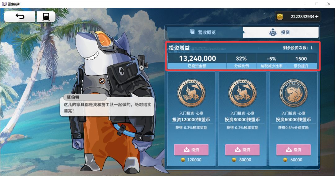 每次抵达海角城的时候,刷新1次投资次数