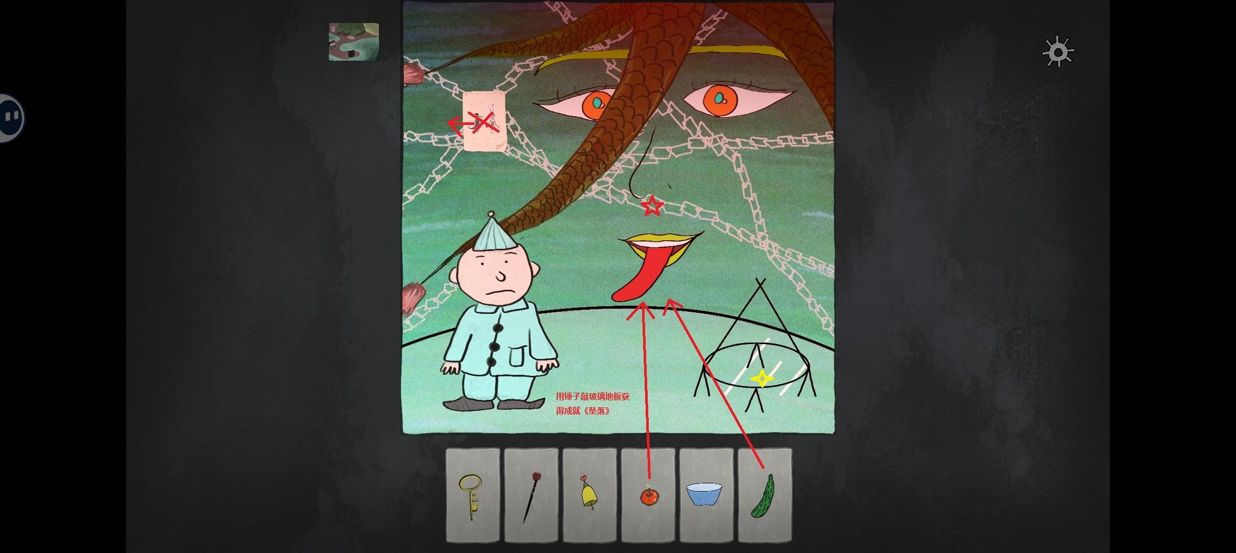 6-1:分别喂给海怪苹果(获得骨锤,出现在左上角)和苦瓜(获得鼻涕,在嘴巴上面的五角星处),打叉的笔记不用看,那是简易攻略,黄色星星的烤架后面有用处。