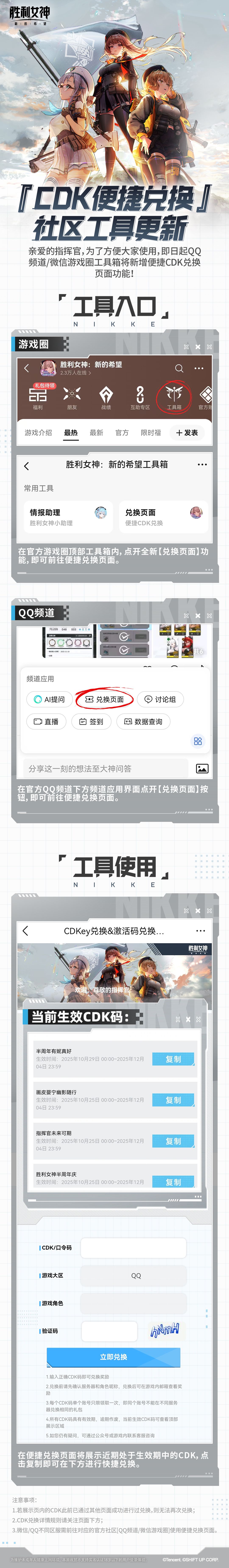 即日起前往官方频道/游戏圈,根据下方图内指引即可前往对应CDK便捷兑换页面!根据账号所属区服选择登录,即可一键复制当前生效CDK兑换码。欢迎指挥官前往社区使用,并向我们提出体验建议及优化意见,我们将在之后持续对功能进行优化!