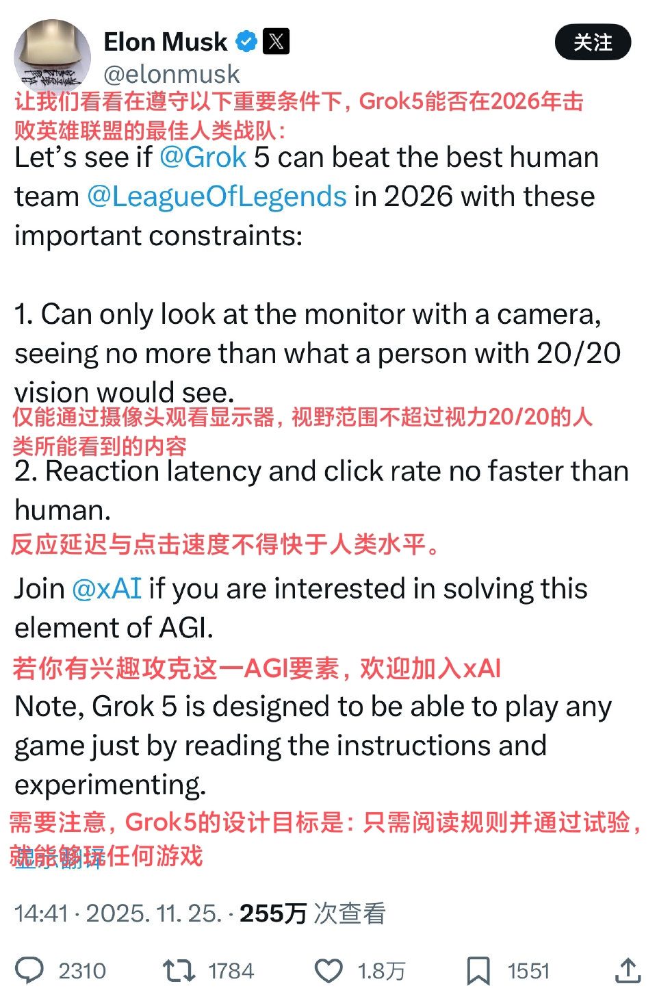 11月25号,马斯克发推文称,其AI平台Grok 5想要在2026年用限制条件挑战最强《英雄联盟》人类战队❗❗❗