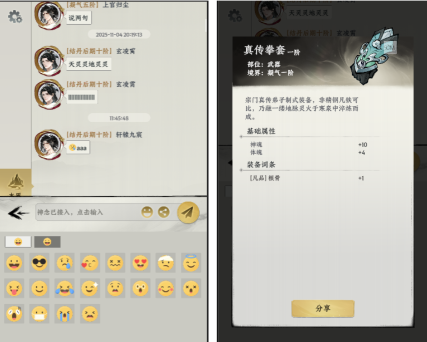 :聊天不能光让我们打字啊,给来点表情包用用!聊天系统迎来多项细节升级,让道友们的仙途社交更顺畅、更有氛围感:首先就是表情包上新:新增主题表情包,用表情就能传递修仙心情;后续还会增加更多的专属游戏表情,大家敬请期待哦。同时也增加道具分享功能:遇到稀有法宝、珍稀丹药,可分享至聊天频道,向同门道友展示你的修仙收获,分享仙途喜悦;