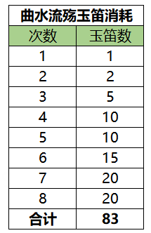 今天开的曲水流觞活动,由于最近大奖没有红玉了,所以消耗从之前的一轮103变成了83,具体消耗见上图表格。