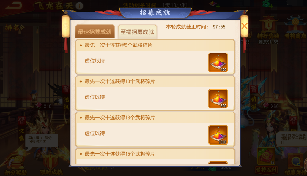2、每轮限时成就持续1小时50分钟,持续时间内最先完成成就的主公才能够获得该成就的相应奖励。