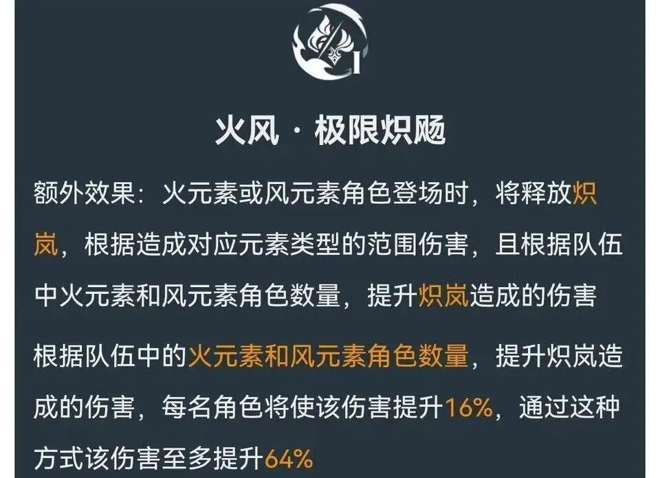 后续的真境剧诗会上线一个全新的元素反应效果,这一个元素反应效果就是当火元素或者风元素角色登场的时候释放一个特殊的攻击效果,并且这一个攻击会根据队伍中火元素和风元素角色的数量提升这一个效果造成的伤害。每名角色可以使该伤害提升16%,如果你的队伍里面火元素加风元素的角色数量达到四名的时候就可以多造成64%的伤害,虽然这一个效果只有在真境剧诗里面可以发挥出来,但是这可是官方的某种暗示爆料了。