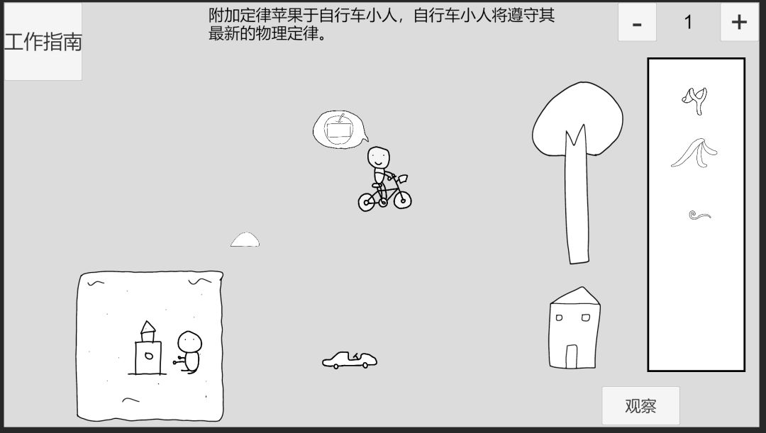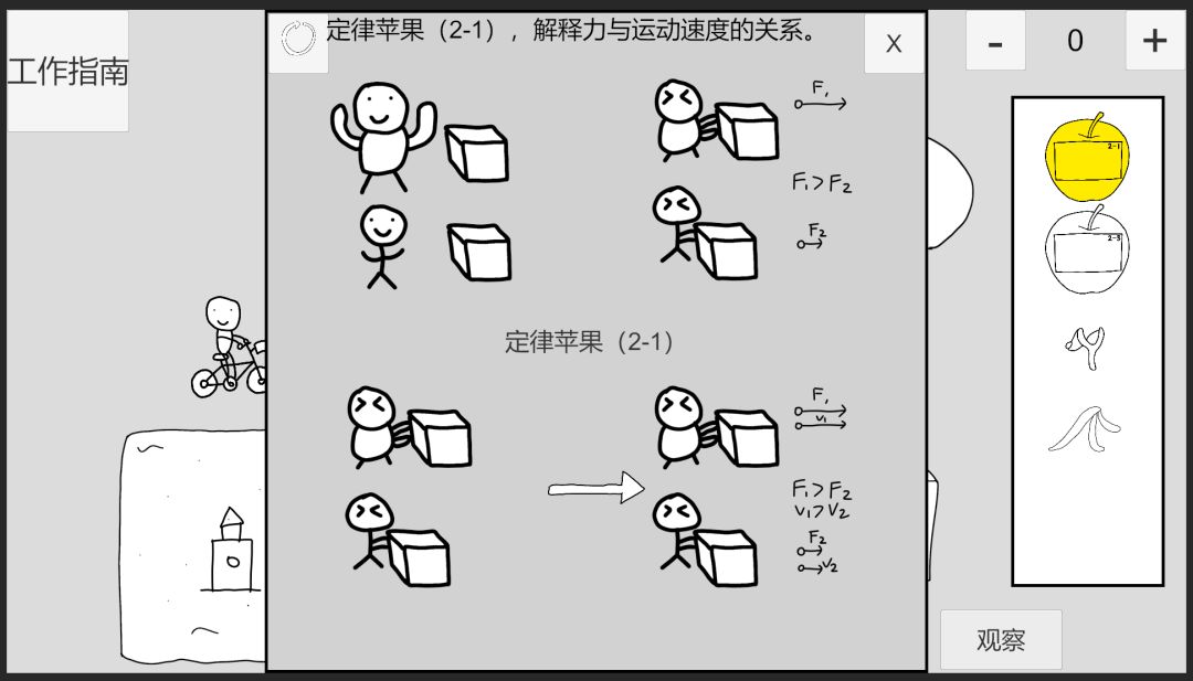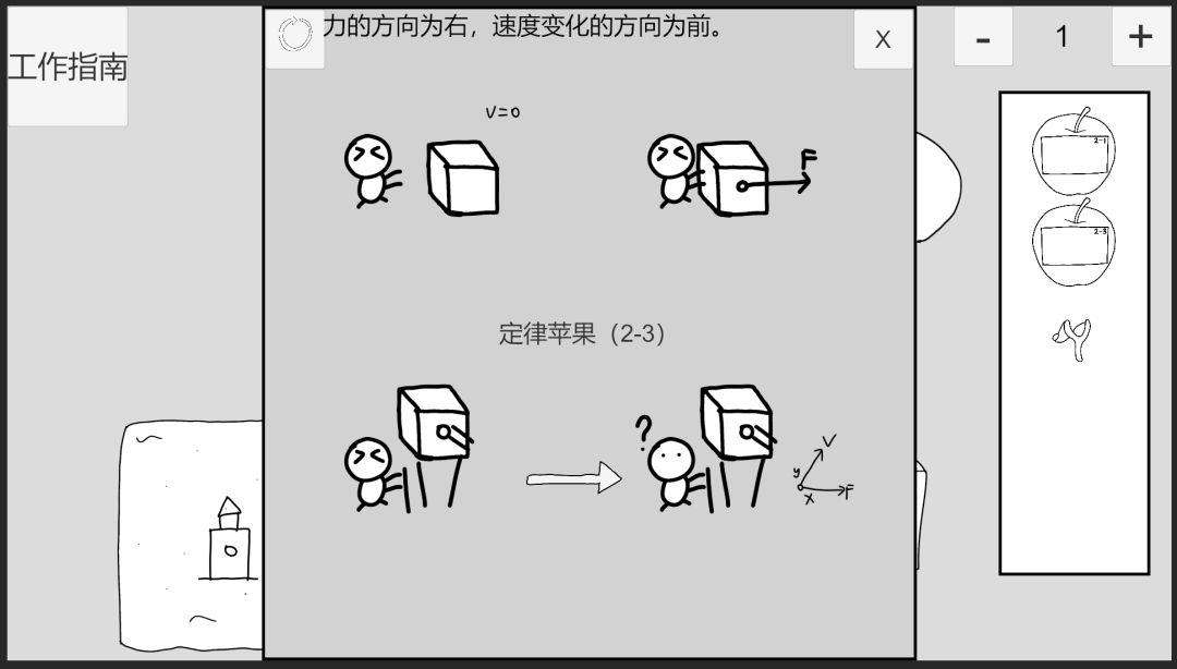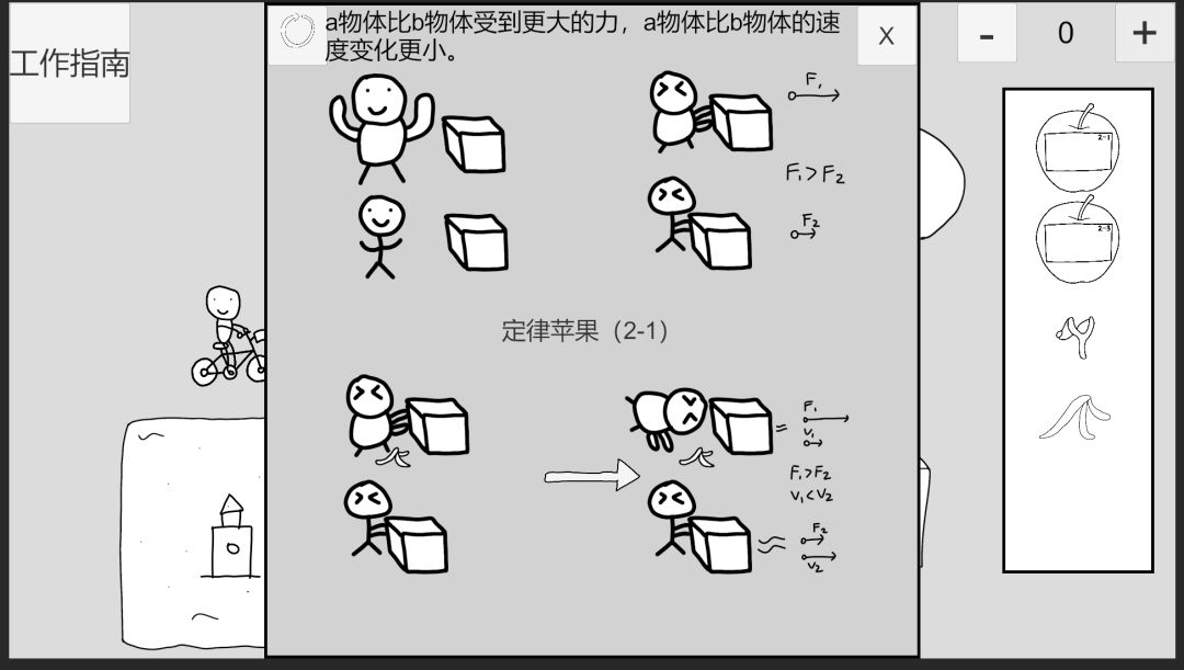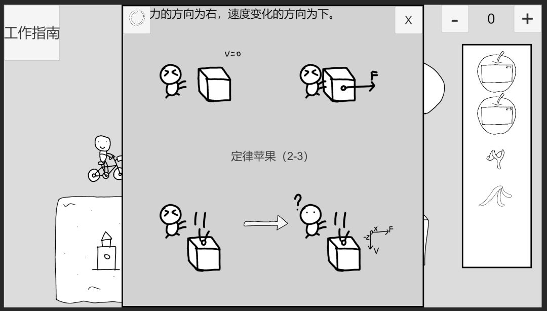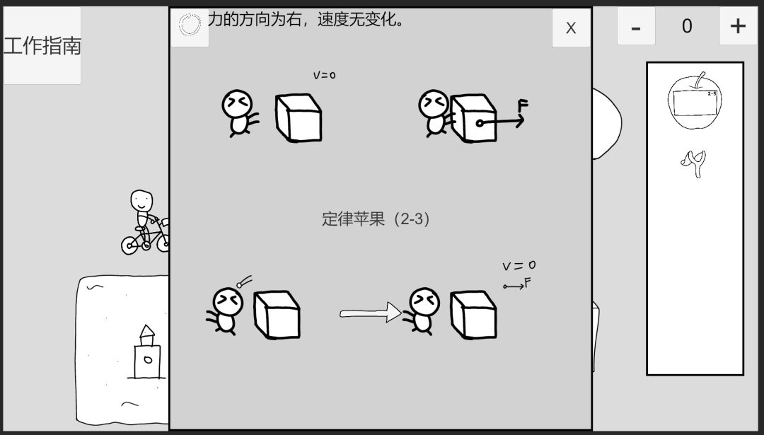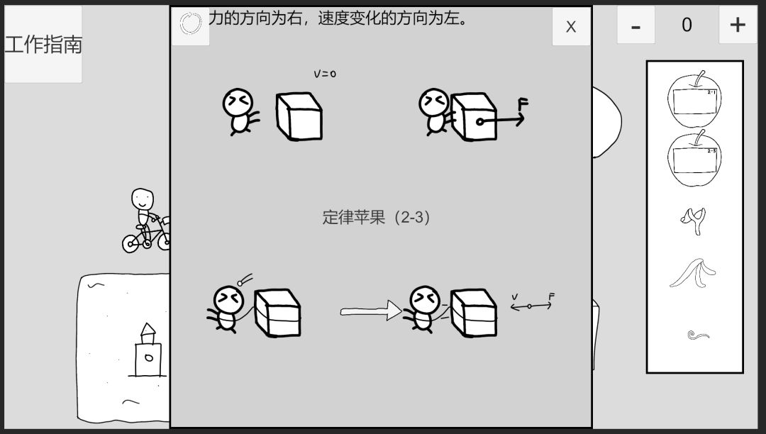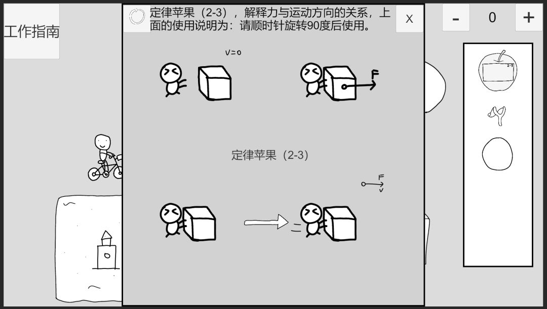 回到时间1,点击自行车小人左上角的苹果可取消附加,观察定律苹果2-3,点击左上角按钮可以重置逻辑,使用弹弓射击物体前方,点击推导箭头,此时逻辑为:物体受力方向为右,速度变化方向为前。