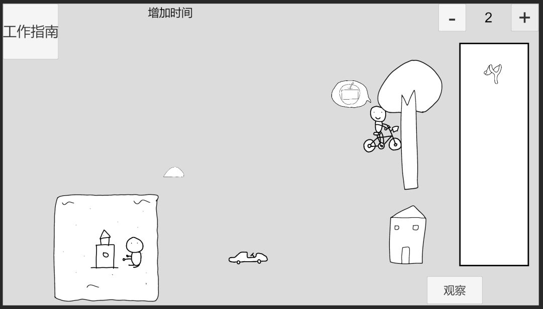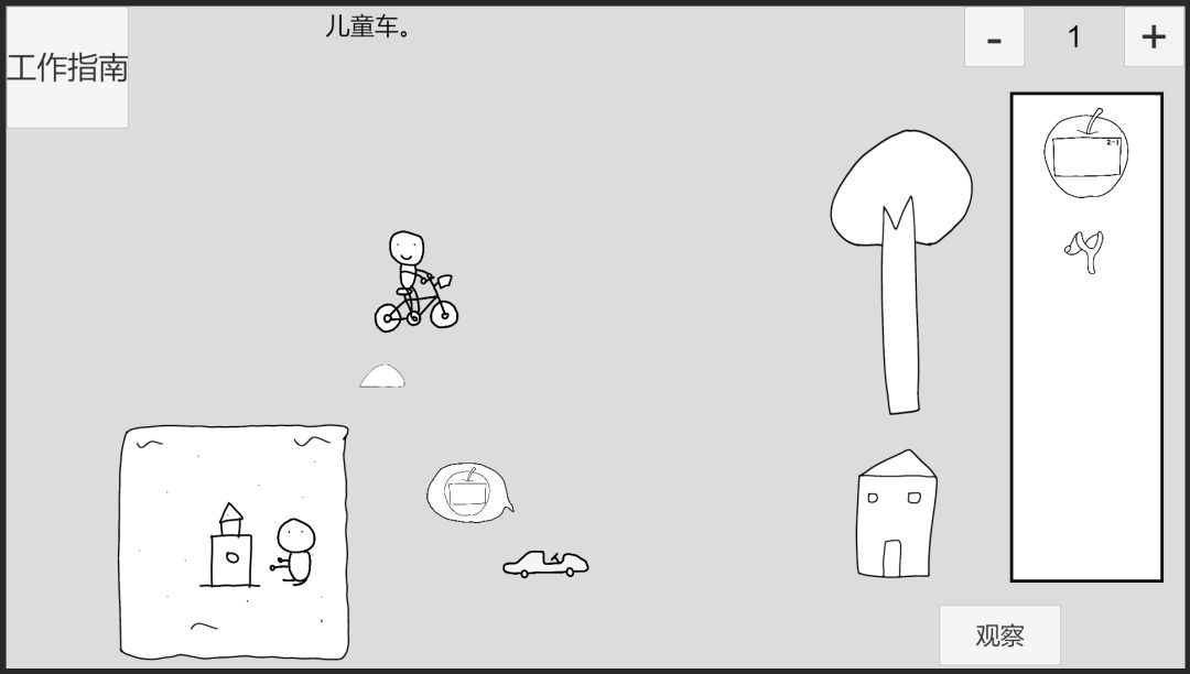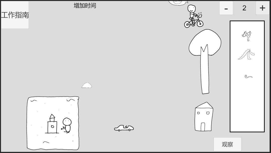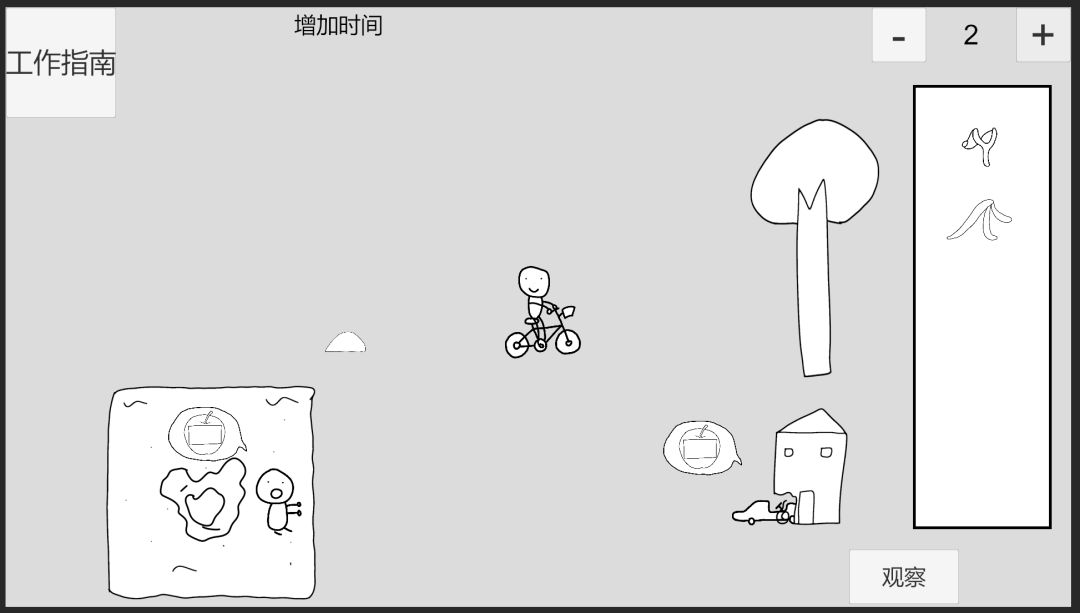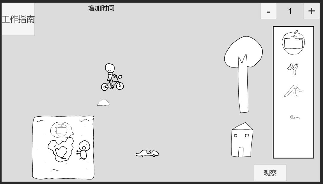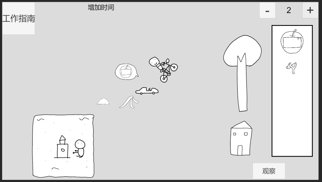 回到时间0,先给儿童车附加苹果2-3,此时儿童车受重力影响,速度变化方向为左,推进到时间1,,推沙堡小人将回头反应,此时给推沙堡小人附加苹果2-1,(不能在时间0附加苹果2-1给推沙堡小人,因为会被震惊无法反应)