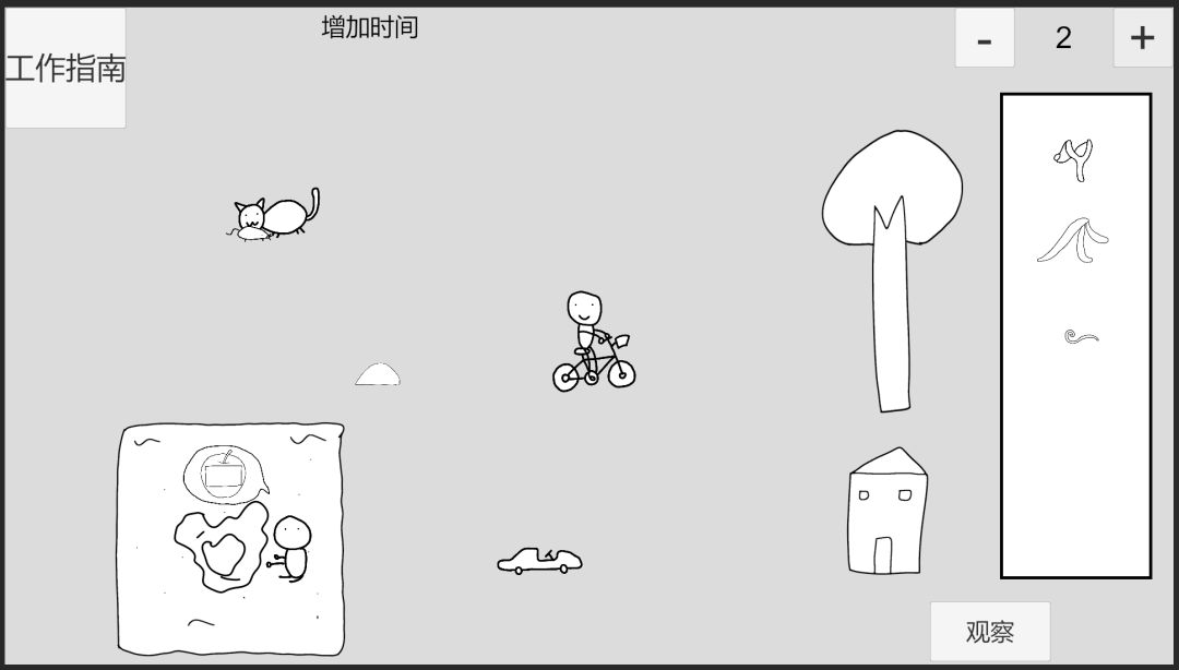 推进到时间2,因为力越小速度变化越大,原本被撞飞的小人反而把小车推开,小车撞入了房子,点击房子,获取绳子。(出现的沙坑为bug)