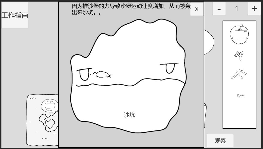 在时间0,附加苹果2-1于推沙堡小人,在时间1时,就会因为沙堡的速度过大,把沙地轰成了沙坑。