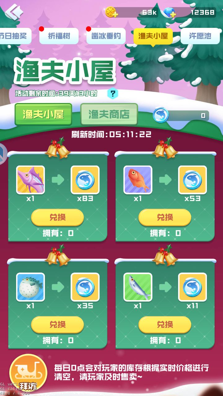 渔夫小屋:球宝们在凿冰垂钓中获得的鱼,可前往渔夫小屋售卖赚取鱼币(鱼的价格每8小时刷新,可选择恰当的价格进行售卖),鱼币可在渔夫商店兑换“称号-觉醒之龙”、“头像-圣诞快乐”等好礼;每日24点,若球宝仍有未出售的鱼,系统会根据当前价格进行清空,请球宝们先尽量售卖完哦。