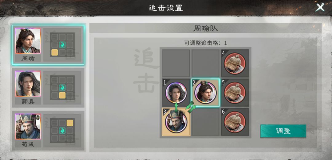 英雄站位:郭嘉无需站追击格,荀彧站周瑜和郭嘉的追击格,周瑜站荀彧的追击格。