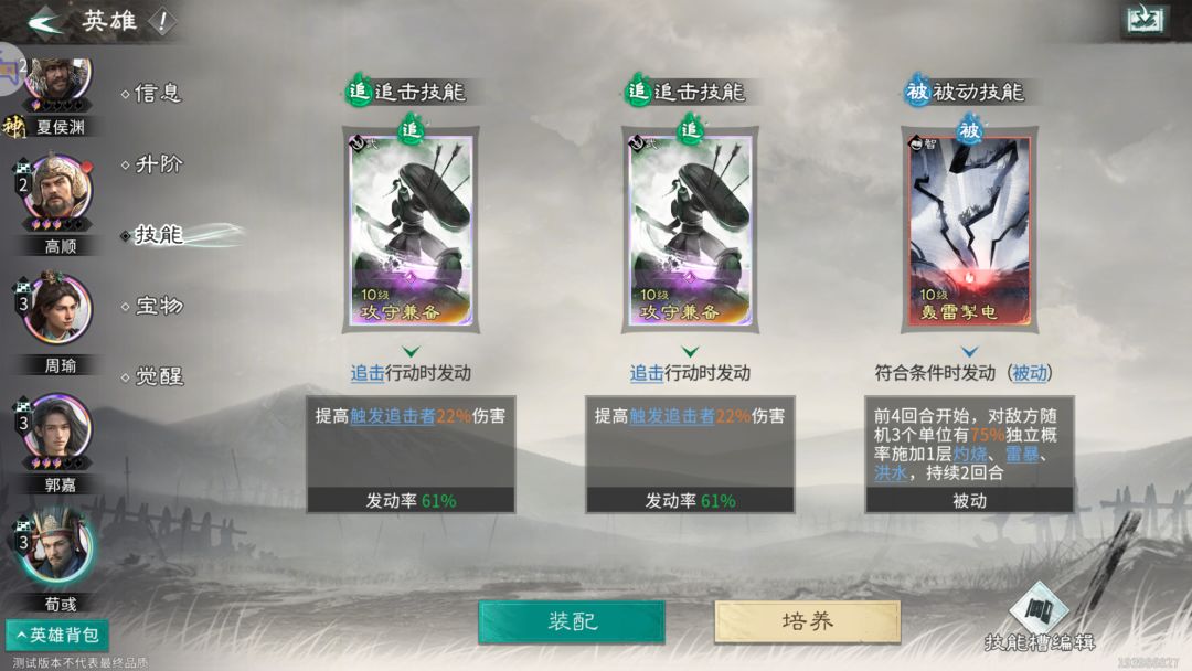 追击技能:推荐携带【攻守兼备】,因为荀彧站周瑜和郭嘉的追击格,所以【攻守兼备】可以提升周瑜和郭嘉2个英雄的伤害。(2个【攻守兼备】的增伤效果是可以叠加的)