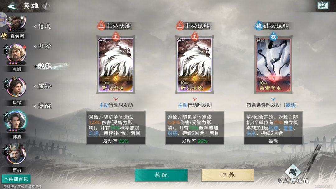 主动技能:推荐携带【野火燎原】,阵容的核心技能,和周瑜同理。