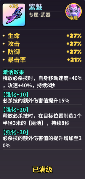 开战时,自身攻击力降低,持续至战斗结束。释放必杀技时,选择1名敌人(优先选择敌方英雄),瞬间闪现至目标面前,造成单体伤害。升级后,附加释放当前拥有的【影煞】,每层可对目标造成1次额外伤害