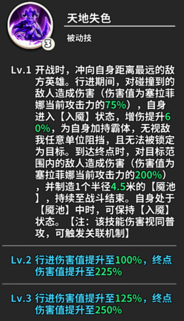 开战时,冲向自身攻击距离最远的敌方英雄。行进期间,对碰撞到的敌人造成伤害,自身进入【入魇】状态,增伤提升,为自身加持霸体,无视敌我任意单位阻挡,且无法被锁定为目标。到达终点时,对目标范围内的敌人造成伤害,并制造1个【魇池】,持续至战斗结束。自身处于【魇池】中时,可保持【入魇】状态。【注:该技能伤害视同普攻,可触发关联机制】