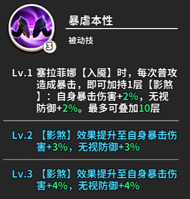 塞拉菲娜【入魇】时,每次普攻造成暴击,即可加持1层【影煞】:自身暴击伤害提升,无视防御提升。受叠加上限影响