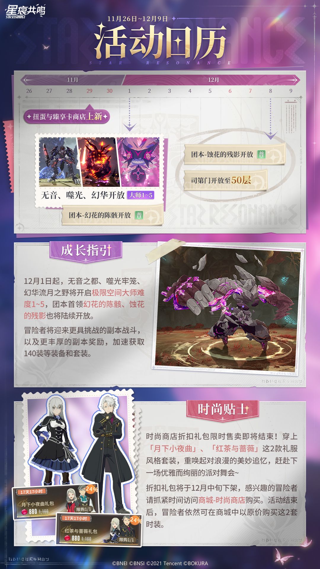 扭蛋蛋池与喵露克斯臻享卡商店将于11月29日上新。12月1日,极限空间·无音之都、噬光牢笼、幻华流月之野将开放大师难度1~5,团本首领-幻花的陈骸也将开放挑战!更多信息请查阅下方活动日历。