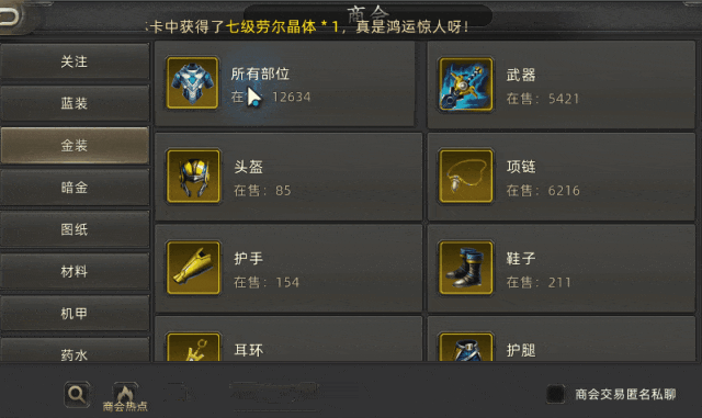 商会已然爆仓!一万多件金装,一千多页装备,海量货品任你选择!整个市场流动极快,自由交易一片繁荣。