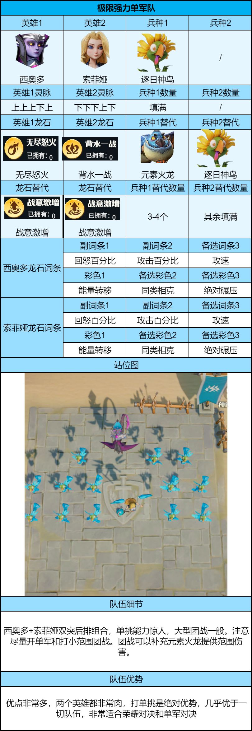 本套阵容队伍英雄以神话以上为主,西奥多+索菲亚单军队:单挑碾压,灵脉龙石抄作业,荣耀对决稳吃分。