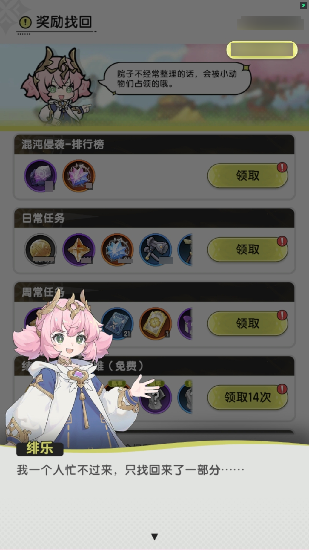 ·短时间不上线,贴心的绯乐可以为冒险者找回一些遗失的奖励~