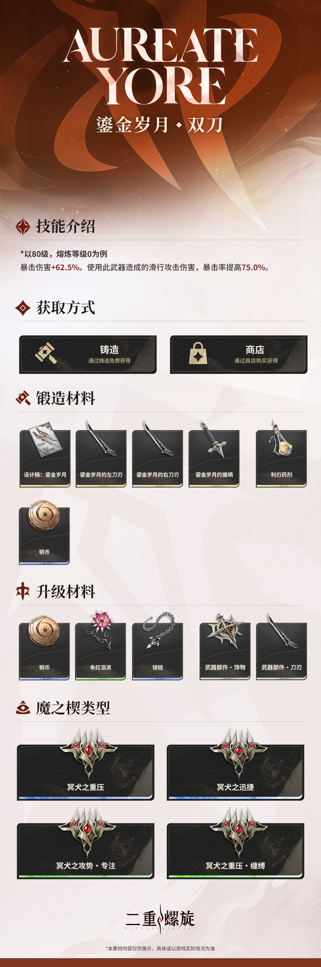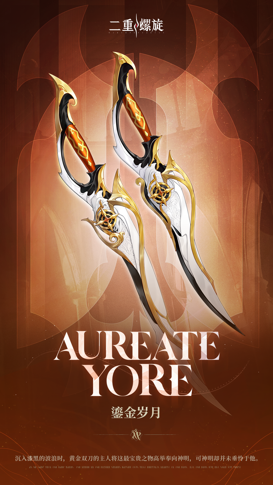 ✦ 武器描述:沉入漆黑的波浪时,黄金双刀的主人将这最宝贵之物高举奉向神明,可神明却并未垂怜于他。