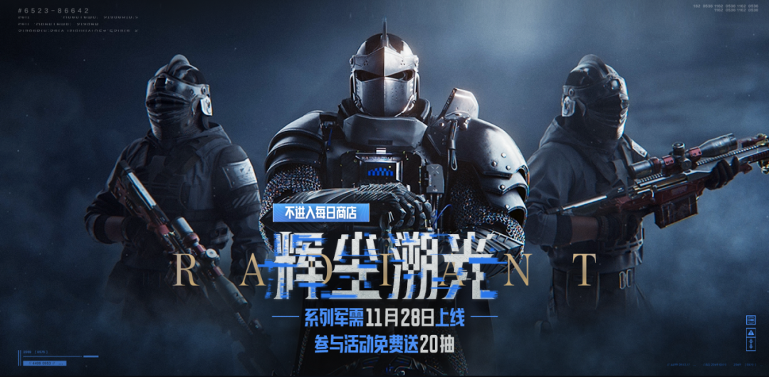 11月28日「辉尘溯光」主题军需即将上线!参与活动可免费获得20抽!橙色品质套装【骑士典范·艾尔熙德】、金色品质枪械涂装【骑士之剑·AX50】上新,【骑士之剑·VSS】返场,老皮带大家抢先看!