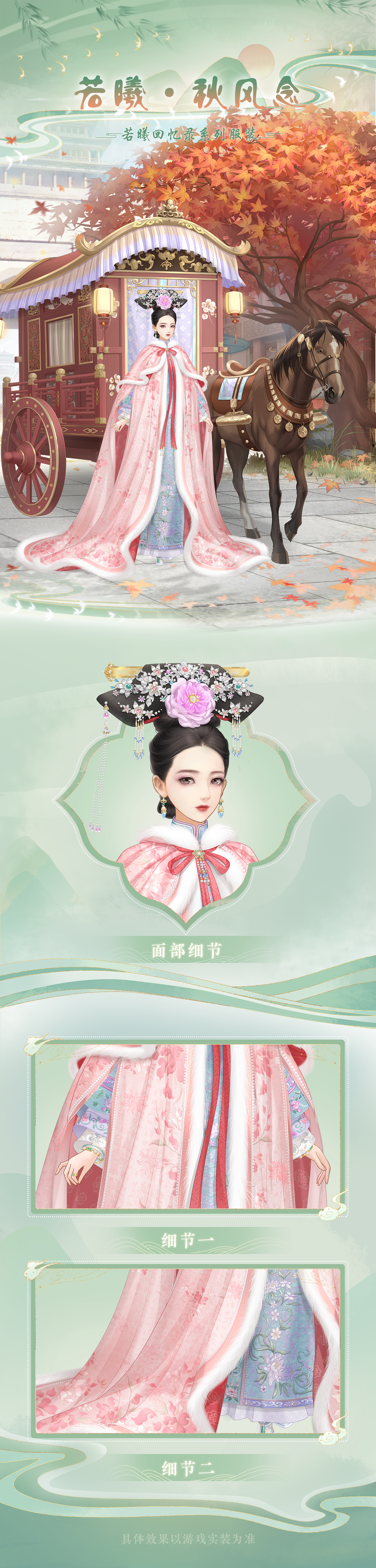 ※ 集齐套装可在回忆录中领取丰厚奖励。每集齐1套套装,可领取对应套装头像,并且可按顺序领取1款主题奖励,内含主题单品:琅华流光、织霞问岁,主题背景:松竹闲庭、秋枫城门。