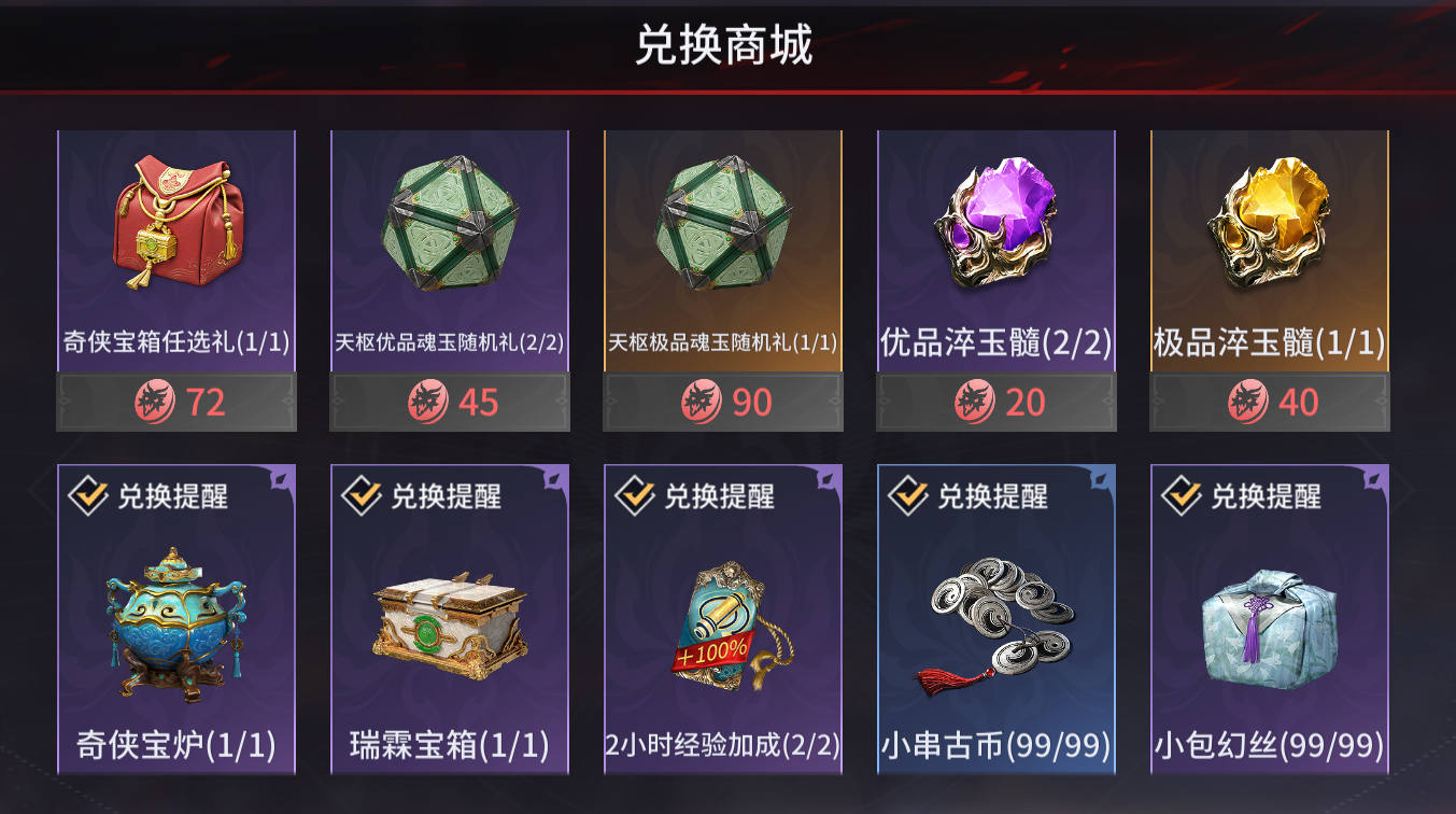 消耗令牌即可兑换【奇侠宝箱任选礼】、【奇侠宝炉】、【天枢极品魂玉随机礼】、【淬玉髓】等奖励!