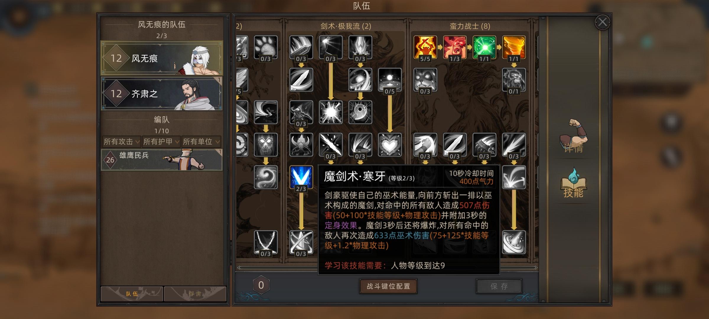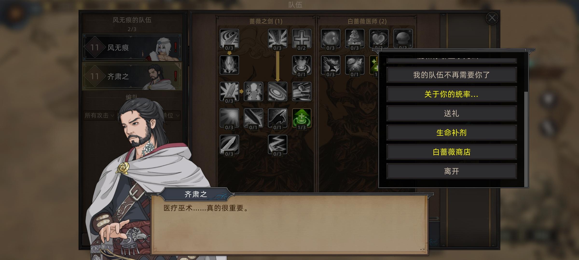 这里选了齐肃之,能打能奶还能降低敌人数值,然后能治疗部队重伤。最重要的是为了14天一次对话领取生命药剂技能,食用加500生命。综合一局下来两三百天可以为主角增加6k-1w点生命值。技能商店里还有三天刷新一次加30生命上限和10气力上限的资料书购买,你值得拥有。