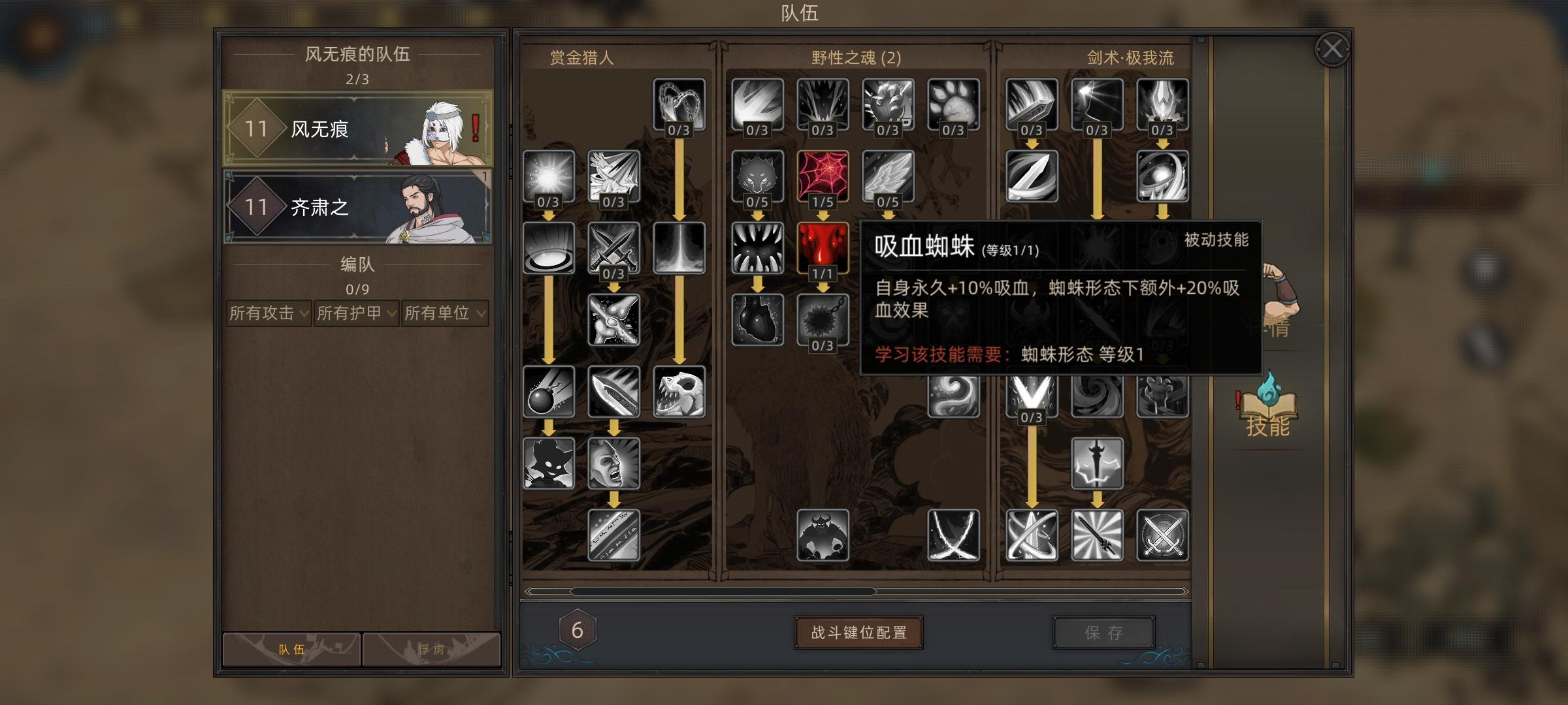 这边因为楼主是五周目难度,所以初始等级11级,游戏等级上限45级。技能点加上开局的一点结晶总共12点可以分配,这里花两点给野兽技能页,点出10%被动吸血。让我们的主角风无痕具备战斗续航能力