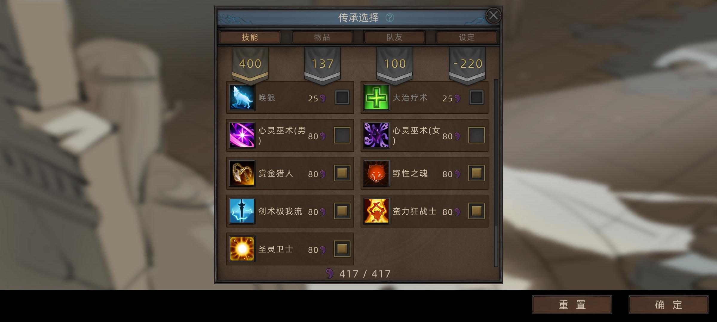 技能选择这里选了五个职业技能传承开局,消耗400点成就