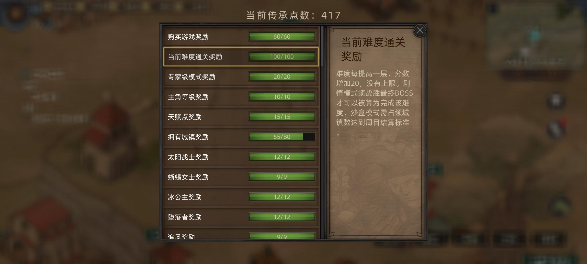 四周目沙盒模式结档目标是12座城,这里楼主多打了一座然后就不打了。打多没意义,上面已经讲过成就系统了,这里不多讲。可以看到周目结档成就是417,那么楼主五周目无名剑主开局就会有417+120+100=637成就去使用。