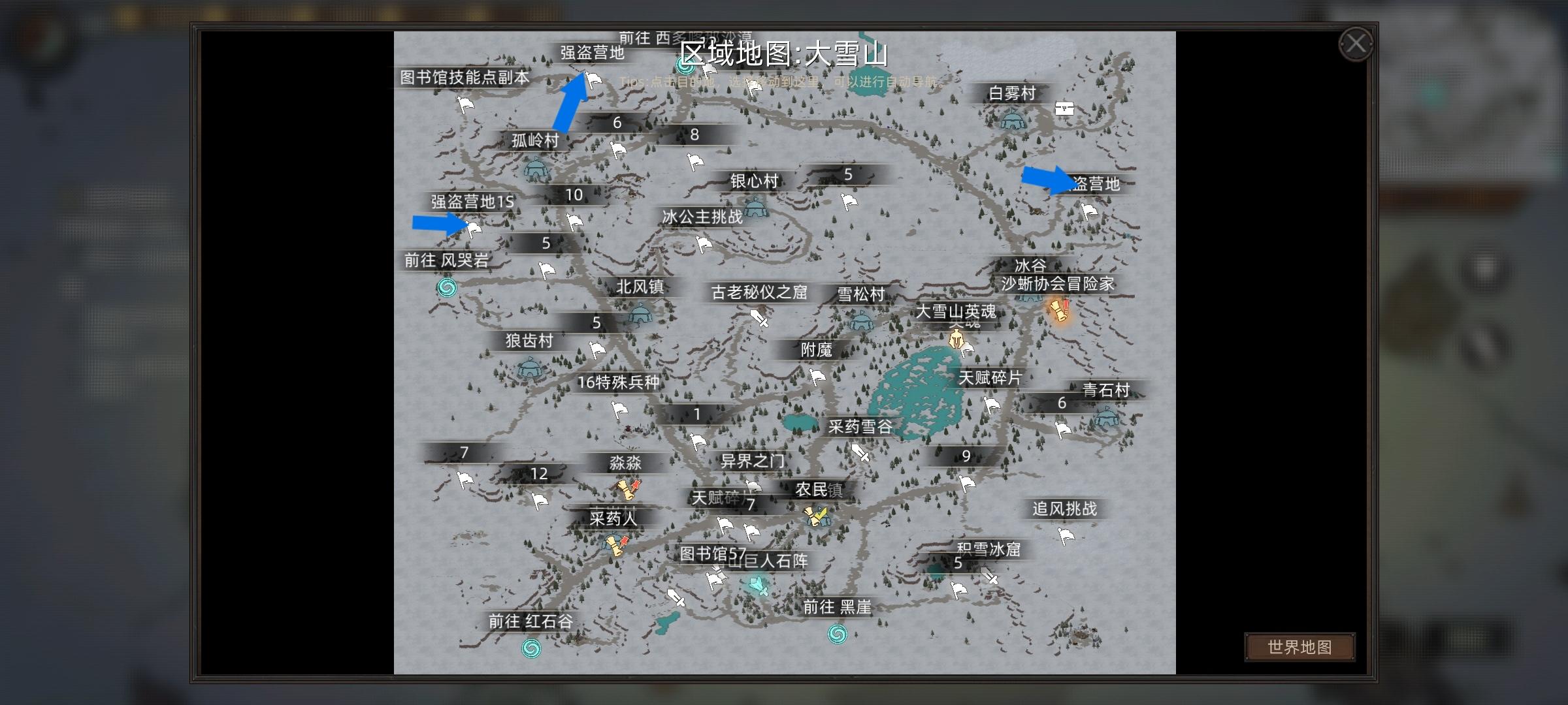 3.每个阵营地图四周大概有两到三个强盗营地,剿灭后会奖励1-2点天赋点。奖励视营地难度而定,中期的时候可以开始刷营地升级了,全部拿下。营地具体位置如图