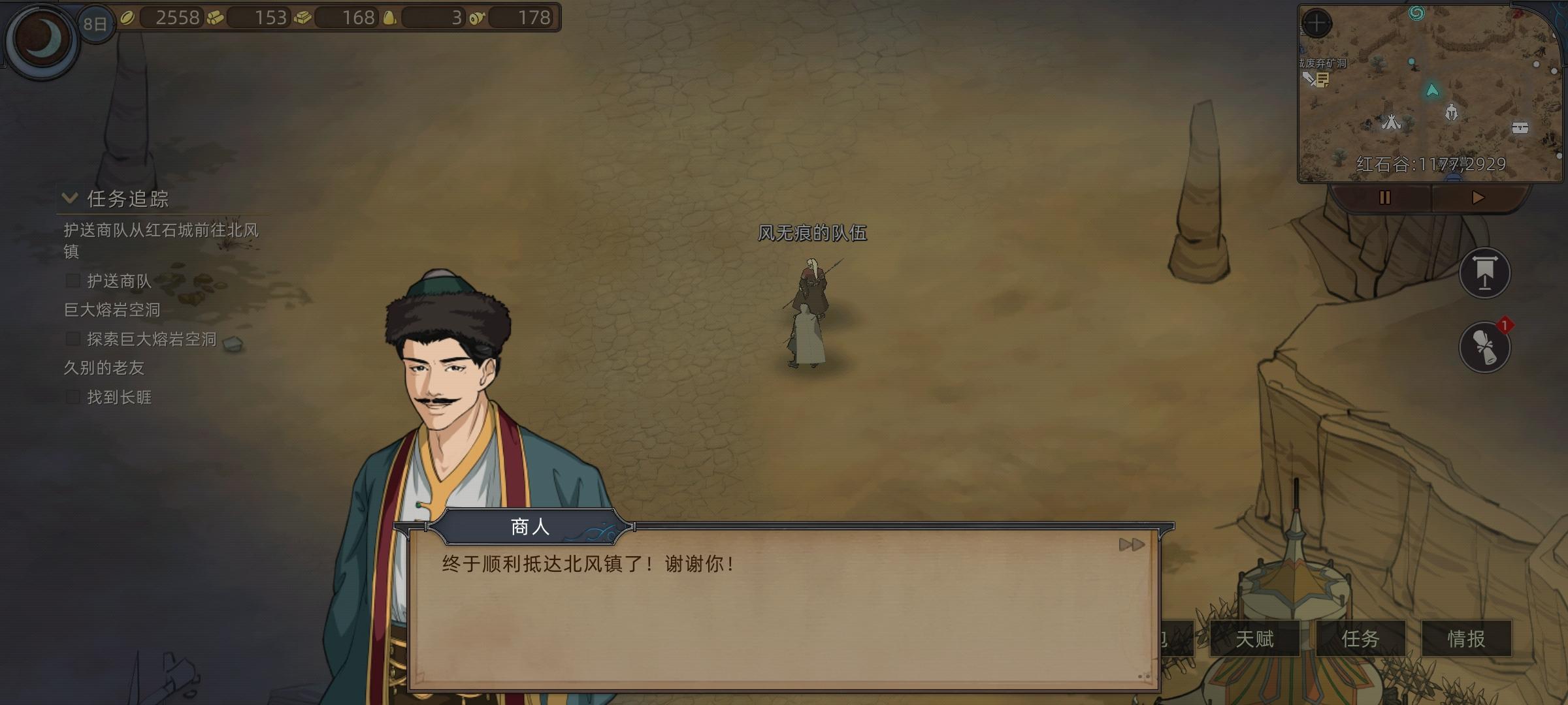 半路上,我们之前红石城领的护送商队任务它自动完成了,那只商队路上没被人打劫~