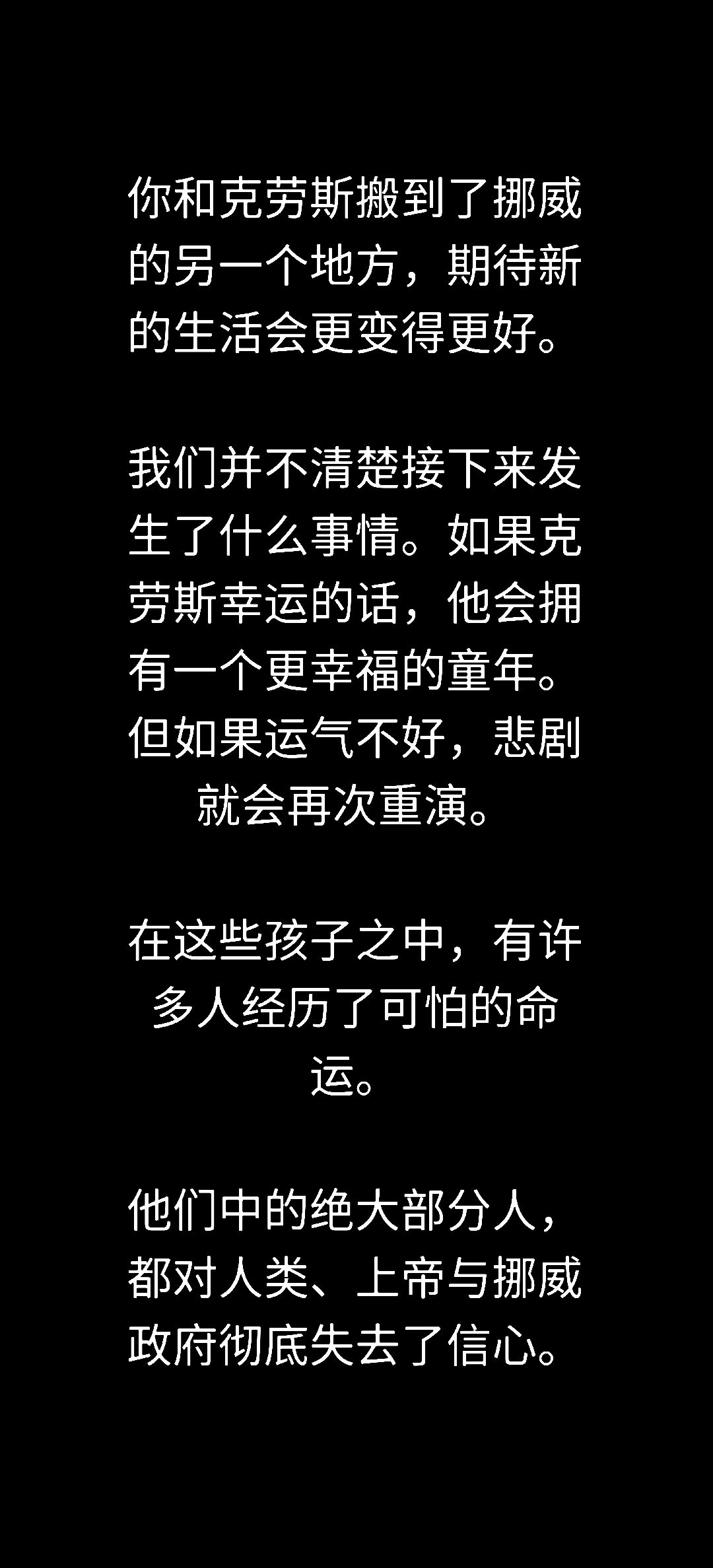二战结束后,挪威政府打算尽快清空哥特霍普孤儿院里的所有孩子,因为照顾这些孩子要花很大一笔钱,而且这些孩子基本患有精神障碍,所以这里的一部分孩子被人收养,一部分被送回了他们的家里。克劳斯被送到了在德国的爷爷奶奶家。但在1947年,国际红十字协会向挪威政府施压,要求接回那些挪威的孩子。于是,克劳斯的爷爷奶奶把他交给了柏林的苏尼威士孤儿院。在那之后,他被辗转送回了挪威。同时,挪威的红十字会也慢慢找到了克劳斯的母亲。他的母亲已经组建了新的家庭,不愿再抚养他,便登报找人领养他。玩家“我”变成了克劳斯的新监护人。
