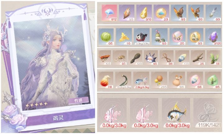 灰色材料:木夹跳甲5、裁衣甲5、板刷狸绒3、盗面毛团5、扣扣毛球6、行鹭羽5、绒领毛团5、结结蕨8、垂穗魔果8、裁尺鱼4、星绸鱼4、蜜妆粉5、蜜妆兔绒6、行鹭羽精粹8、结结蕨精粹5