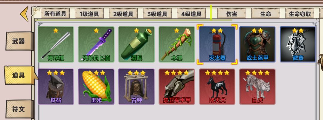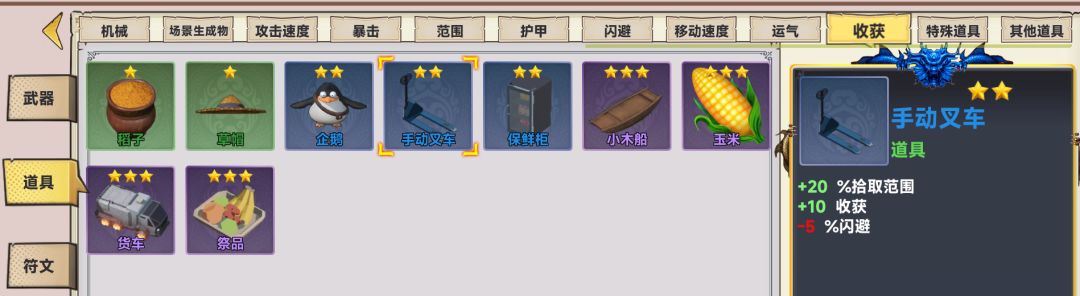近战伤害属性:一定要多拿带 近战伤害 属性的道具,见到近战伤害道具就拿,近战伤害是近战武器的基础,不要光顾着拿收获属性道具,被的属性就忽略了。