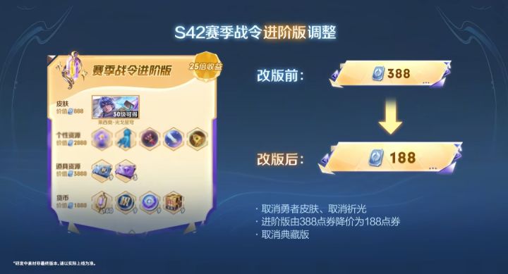 据悉,本次进阶版战令的调整使其价格从388点券降至188点券,降幅超过50%,为玩家节省了200点券,相当于直接打了五折,但同时,随着价格调整,战令系统也进行了简化,取消了典藏版战令,使选择更加直观,新版进阶版战令也取消了勇者皮肤奖励和祈光之泉奖池![[TapTap表情|TapFamilyxdoro2_粉狗发射]](https://img-tc.tapimg.com/market/images/934f58613a089b2e214eb0e0638bbbad.gif)