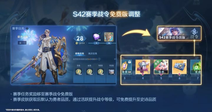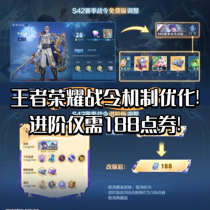 近日,王者荣耀官方正式公布了S42新赛季战令系统的全面优化方案,此次优化的核心在于进阶版战令价格从原来的388点券大幅降低至188点券,同时取消了典藏版战令,并对赛季皮肤获取与升级机制进行了重大调整,新战令系统在提升性价比的同时,首次引入了皮肤品质升级功能,玩家可通过提升战令等级将赛季皮肤从勇者品质免费升级至史诗品质,这套全新战令体系预计将随S42赛季于2026年1月7日左右同步上线![[TapTap表情|TapFamilyxdoro2_粉狗比心]](https://img-tc.tapimg.com/market/images/101c7e3200596fe8e03765080b467fb8.gif)