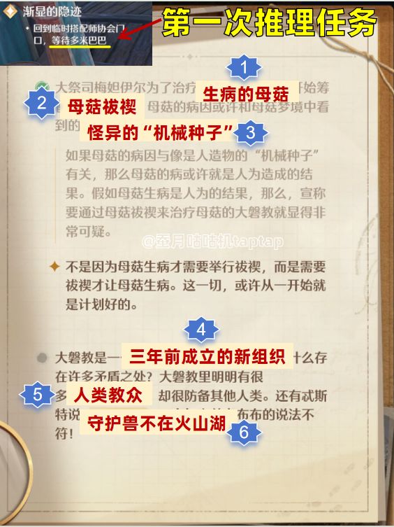 🏹渐显的隐迹的第一次推理:生病的母菇➡️母菇祓禊➡️怪异的“机械种子” 三年前成立的新组织➡️人类教众➡️守护兽不在火山湖