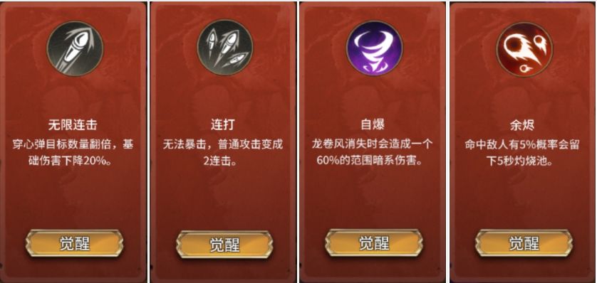 龙卷风的无限、连击、极速----》穿心弹的无限收割、狂暴加速、爆杀攻击----》散射弹的幸运、专精、高质----》火球术的连刃、无限、灼热