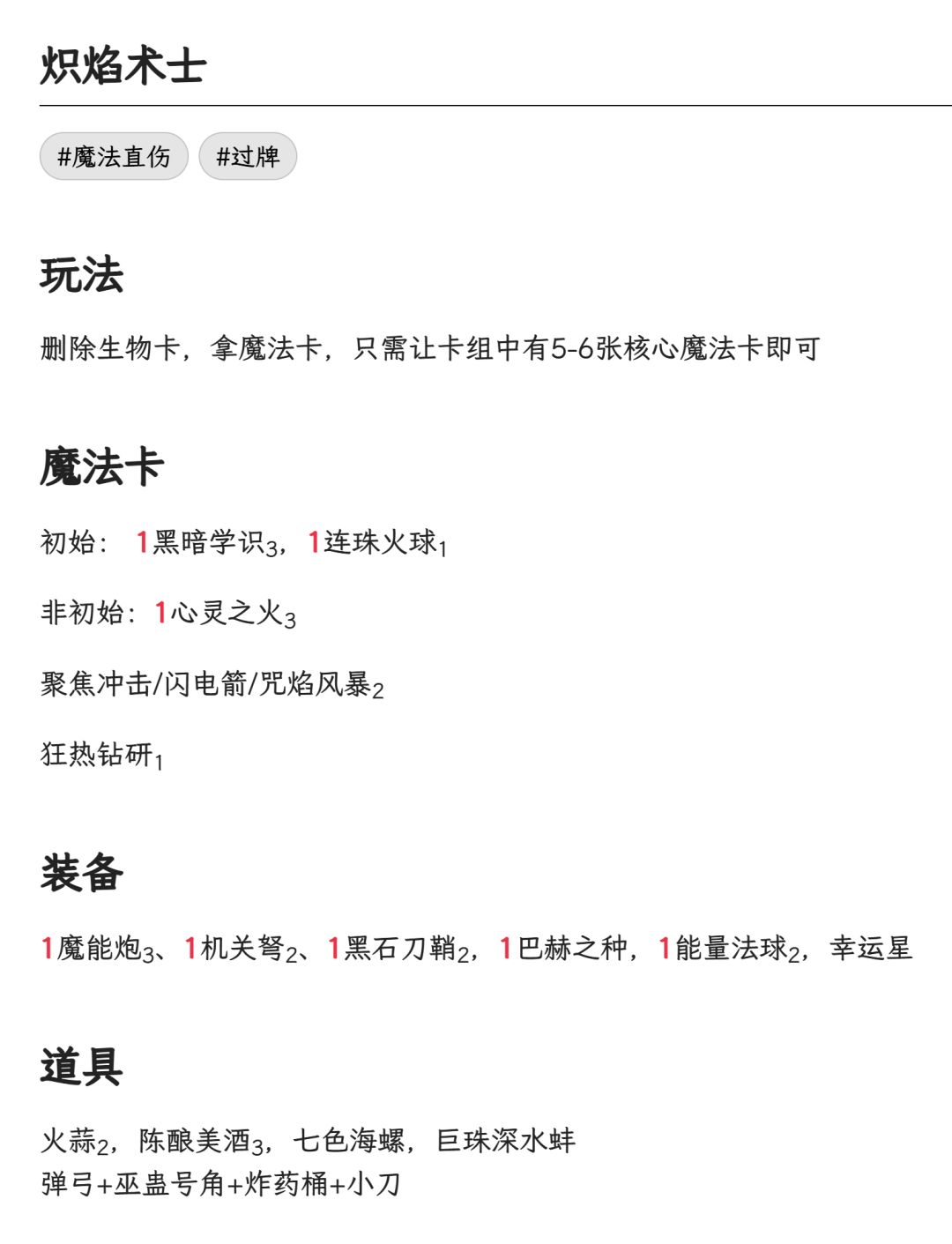 绝弦攻略首先放上牌组和道具,以及入场效果展示(无心灵之火)核心牌:咒焰风暴,狂热钻研,黑暗学时,幼龙能量法球。中后期完全可以把两张闪电箭去掉,连珠火球也可以去掉。本思路仍不是最强形态,完善后可以...